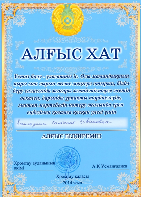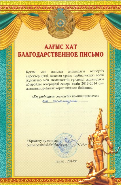 Важным показателем работы гимназии №2 явилось награждение педагогического коллектива Грамотой в номинации «Лучшая городская школа» - «Ең үздік қала мектебі». Отдельные Грамоты и Благодарственные письма получили учителя гимназии: Абденова Б.З., Есенгазина С.И., Уразалина К.С.