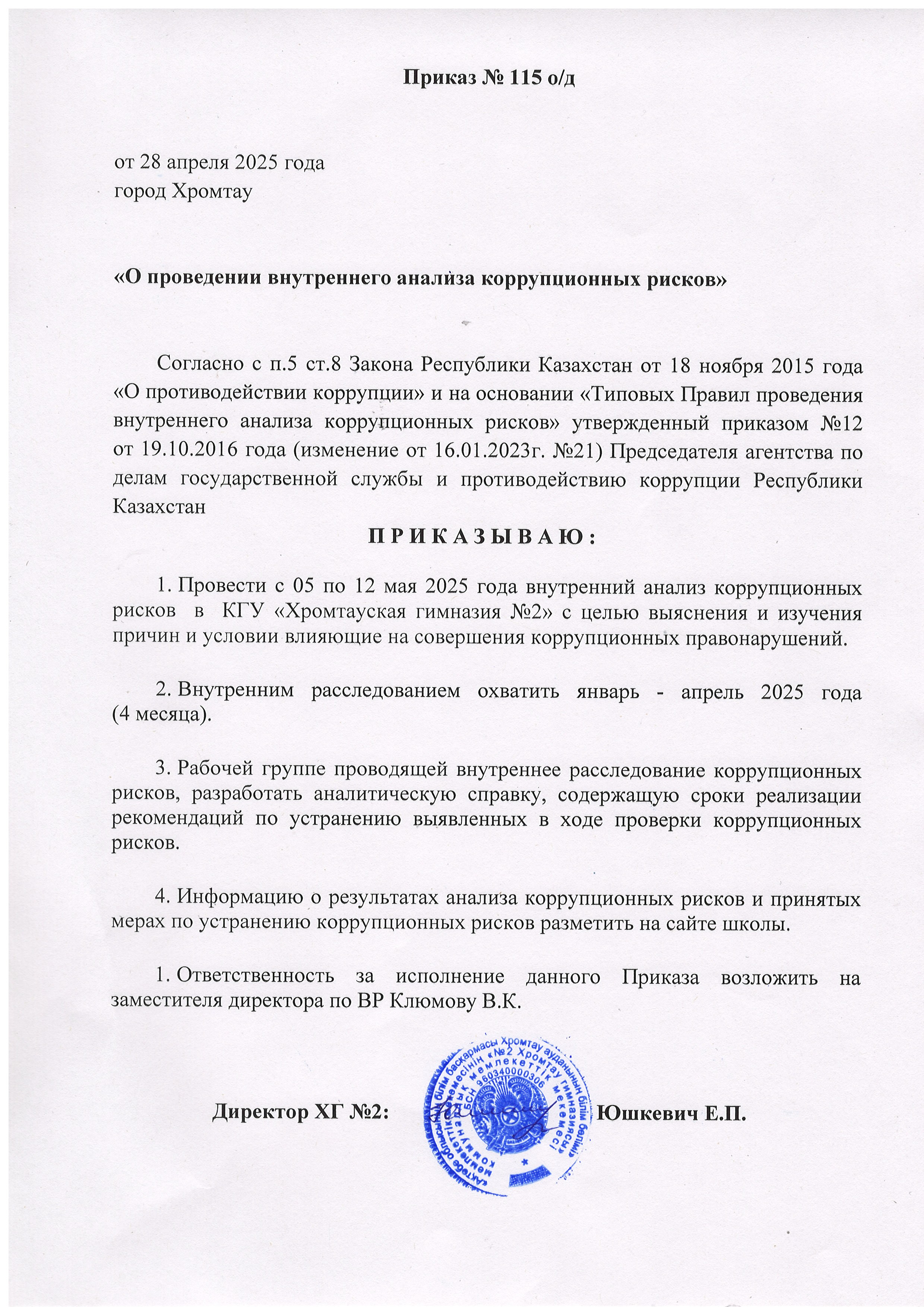 Сыбайлас жемқорлық тәуекелдеріне ішкі талдау жүргізу туралы бұйрық 28 сәуір 2025 жыл