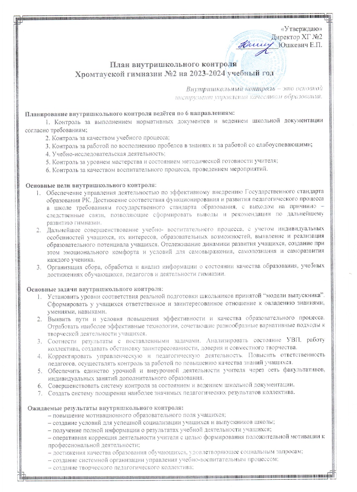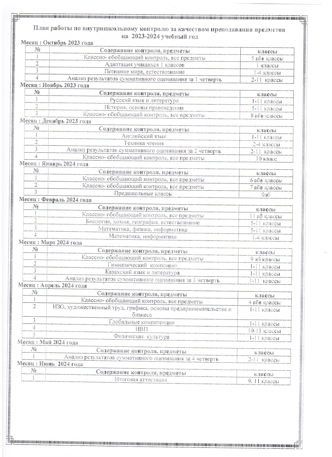 2023-2024 оқу жылына арналған №2 Хромтау гимназиясының мектепшілік бақылау жоспары 1 бет 2 бет